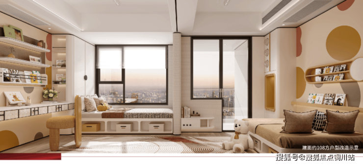作为“主力王牌”产品,建面约108㎡户型采用去过道化设计,空间灵活可变,可打造开放式厨房拓展家庭场域,适合年轻夫妇;也可将北向书房与次卧融合,变身双孩套房,灵活适应家庭成长需求。