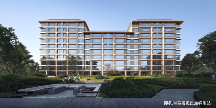 洋房使用香槟金铝板构成横向线条,局部斜面处理,使得线条更加丰富立体,在转角处采用了错层的弧形铝板挑檐搭配弧形转角飘窗,让建筑的角部和山墙面显得更加柔和与精致。