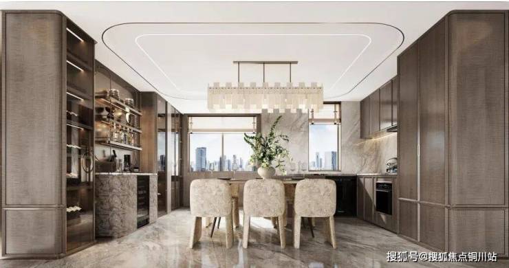 客餐厅:大尺度石材背景与木质界面构成冷暖平衡,开放布局呈现酒店式体验;