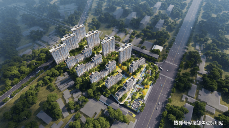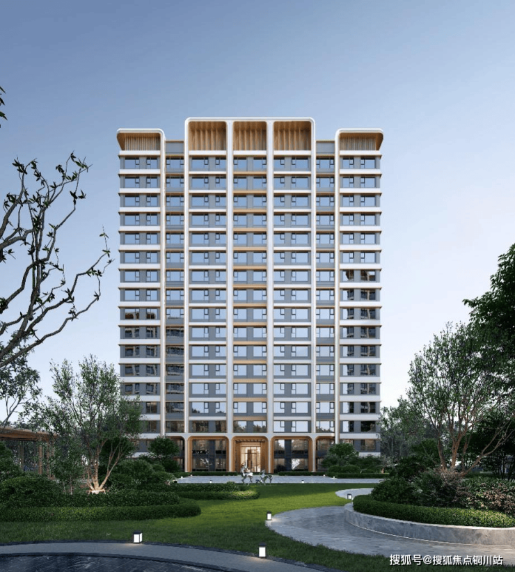 小高层主体以温润的米白色与沉稳的高级灰为基调,干净利落,同样点缀的香槟金铝板与洋房形成呼应,保证了立面形象的统一性,顶部造型的精细化处理和底部2层通高的大堂,使得建筑更具尊贵感。