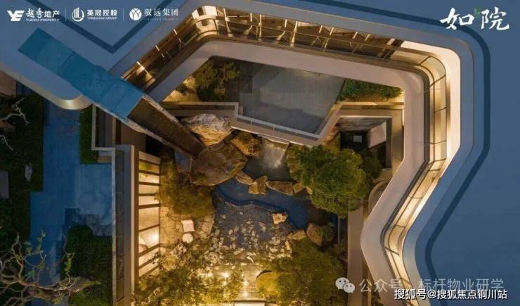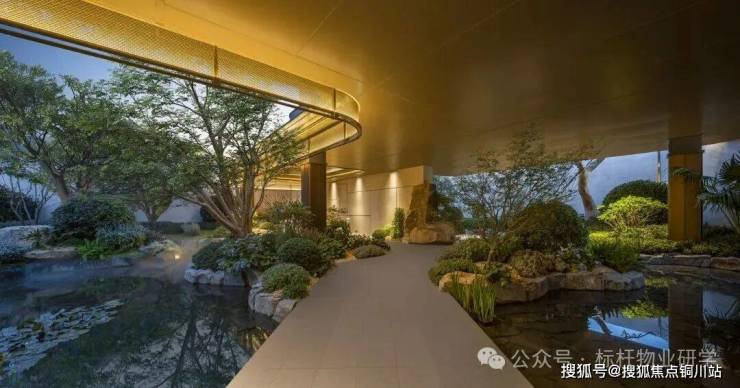 景观中庭的设计是市面上极为少见的三层观景式设计,以北宋画家范宽的《溪山行旅图》为范本,叠石、壑松及高低落差约15米飞瀑,亭台楼阁、檐下的游廊、小桥流水相互映衬,宛如一幅山水画卷。