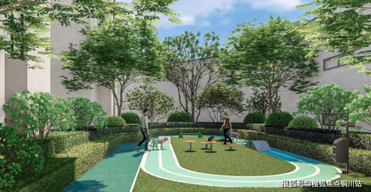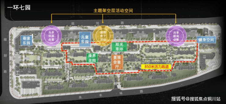一条景观主轴即850米的活力跑道将景观会客厅、阳光草坪、儿童乐园、健身空间、康养空间、主题架空层和萌宠乐园一一串联,营造一步一景的风情。