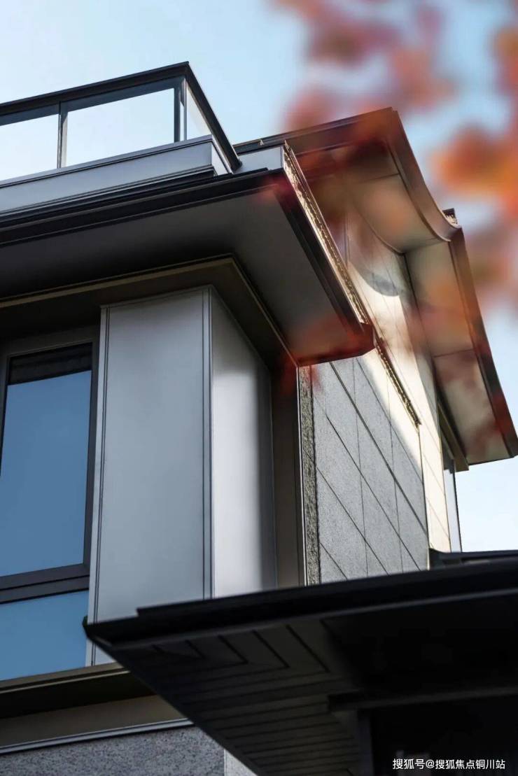 大门金属饰面与歇山抱厦的檐廊结合,这一灵感来自收藏于中国台北故宫博物院的南宋名画《华灯侍宴会图》。合院运用到的擗帘杆、叠墅使用的寻杖绞角造,都能与宋代古画的建筑形制一一对应。