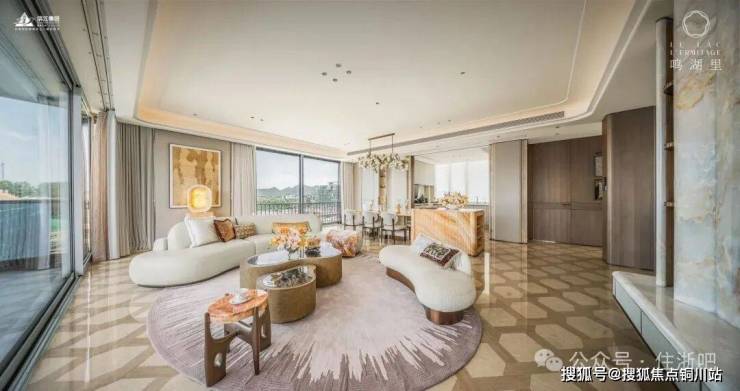 建面约267㎡下叠装修效果展示间【湖风雅颂】客厅270°环景长窗,把风景引入室内。每一个尺度都在彰显湘湖岸王者的回归。