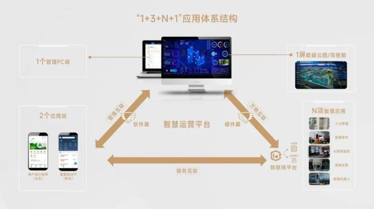 其中第一个“1”,即搭建一个社区智慧运营平台。这是中交和园全感知AI智能社区成本最高,也是最具先进性的地方。有了它,社区智能化系统相当于有了一个统一指挥和交互的“超级大脑”,不仅能发号施令,“指挥”社区内设备、设施和服务体系进入工作状态;更能接收并分析设备、设施和三方平台回传的数据,从中更精准地掌握居者需求,从而提供更加个性化的服务。