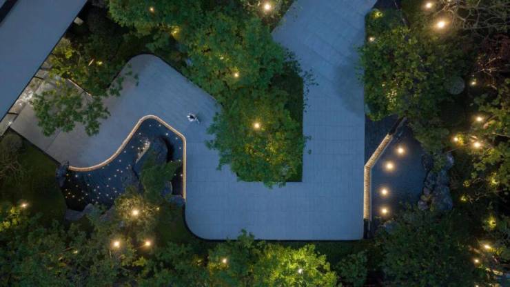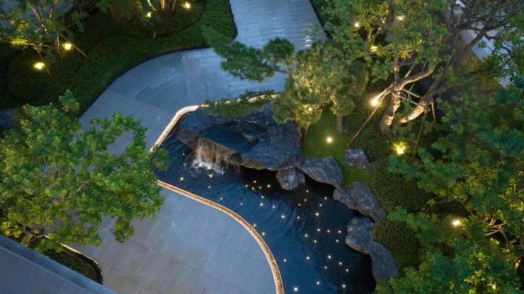 微风拂过,脚下是摇曳的树影与悠然的时光,身畔是潺涓水声,而水流之上的点点灯光指引去往的是家的方向。归家路上异形跌水的呈现是优雅形态与高精度施工的完美配合,需要克服诸多细节上的问题。如水流方向的调试、跌水面平整度的调试、水流量大小的控制等等,经过现场反复调试打磨,最终得以呈现出较好的落地效果。