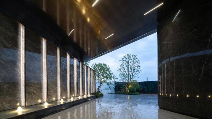 耳边听闻涌泉水声潺潺,缓步走入门楼内部。光影与沿小径蜿蜒的弧形景墙相互辉映,营造出一种富有故事性、充满场景感且序列化的空间氛围及格调,打造一个层次分明同时又具有连续性、关联性的空间。每一个细节都充满艺术感,每一个角落都散发着品质与优雅的气息。