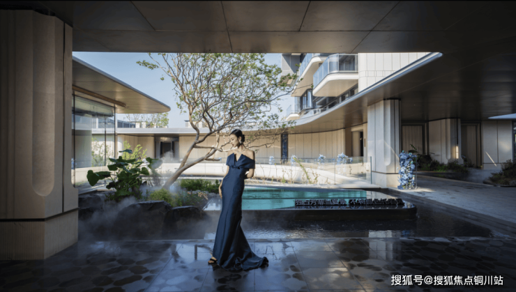 步入示范区,观澜廊道以玻利维亚蓝奢石与库班绿石材等珍稀石材铺就的路径,引景入室,狮子林的园林美学于此新生。取意网师园“竹外一枝轩”,臻选斜飘紫薇徙栽入园,为归家路添一份灵动雅趣。序厅,天光自圆形穹顶倾泻而下,与地面方形水景相映成画。下沉式庭院叠瀑水流倾泻而下,以玻利维亚蓝、库班绿、蓝金刚花岗岩等奢石,搭配羽毛枫、银叶菊等植物景观将江南层次感画卷徐徐展开。