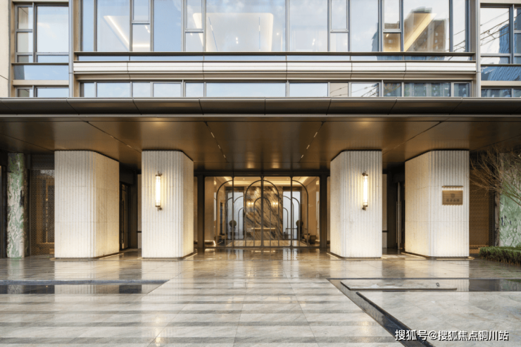 整体搭配香槟金铝板型材,基座采用深色石材,单元门厅采用维多利亚白石材及仿白金铝板,无一不凸显出项目的匠心和品质。