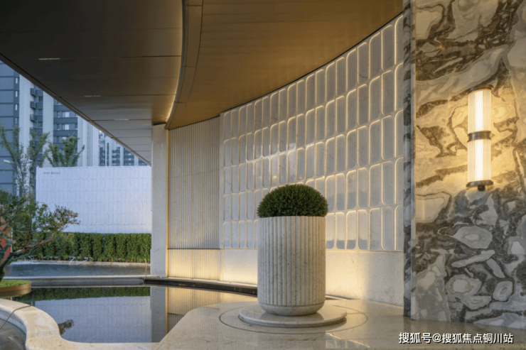 先看社区大堂:高门大院的直视感,社区主入口的设计灵感来自于上海华尔道夫酒店,石景墙上还雕刻有百合花纹,和项目案名相得益彰。