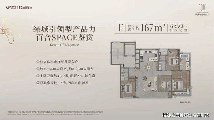 项目的另一款户型为约167㎡,采用LDKG布局,空间利用率非常高,为稀缺的宽厅+四房+南向双套房+墅级主卧套的设计。