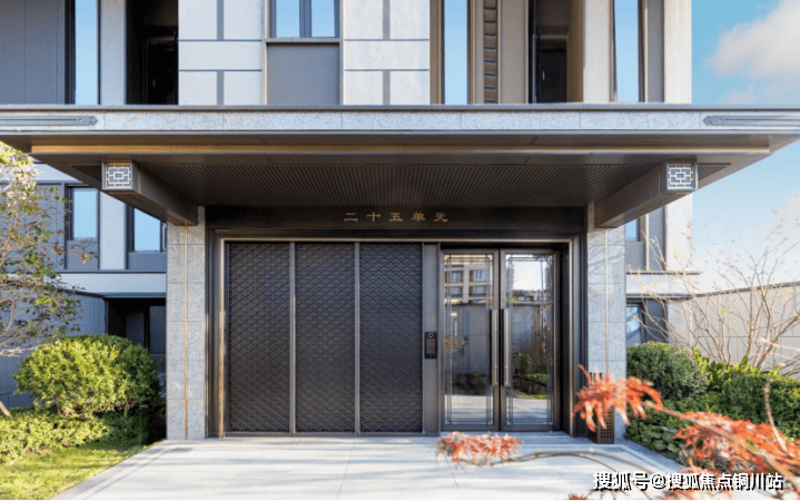首层单元门归家大堂延续新中式风格,极具辨识度,细节处镌刻着华纹,门前两侧绿植点缀,彰显大家风范。