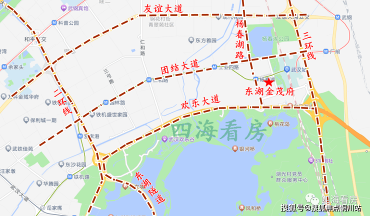 东湖金茂府位于杨春湖路以东,和谐路以北,武汉火车站以西,大区位上属于杨春湖高铁商务区,行政划分属于洪山区,距离二环线4.2公里,属于三环内。