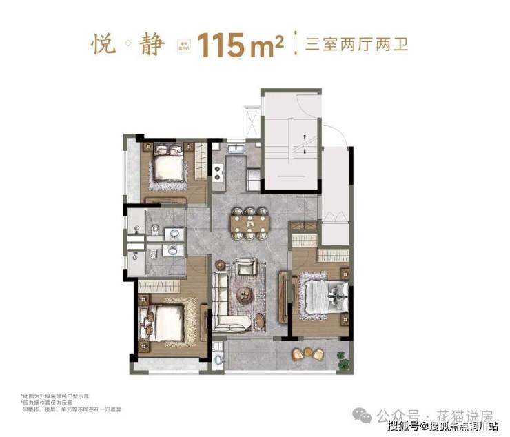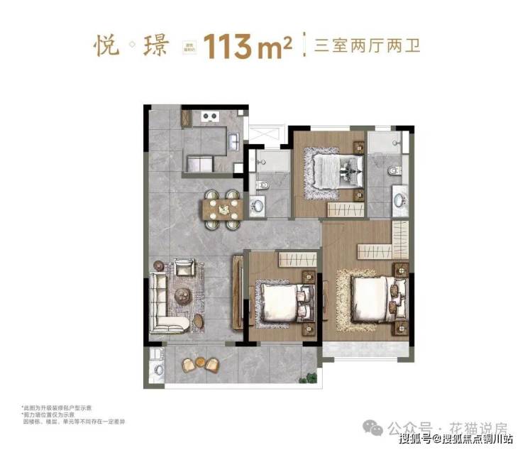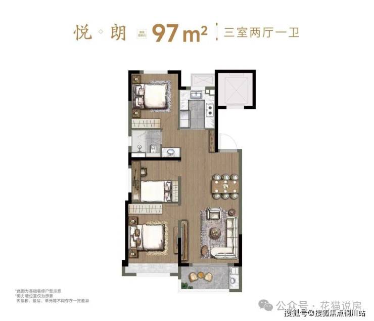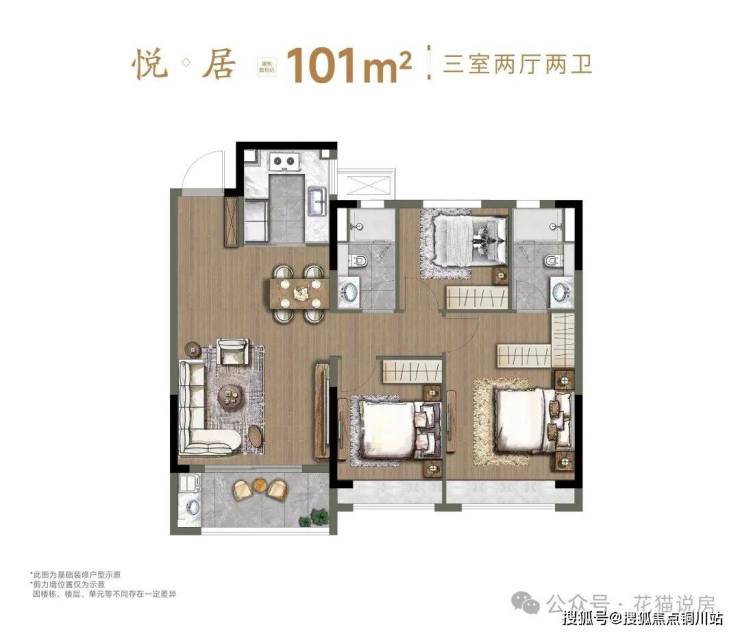 还有101平三房两厅两卫,跟97平最大区别一是三开间朝南,双卧朝南采光棒;二是多了主卧独卫,私密感更佳,适合小家庭或者老人带娃居住。