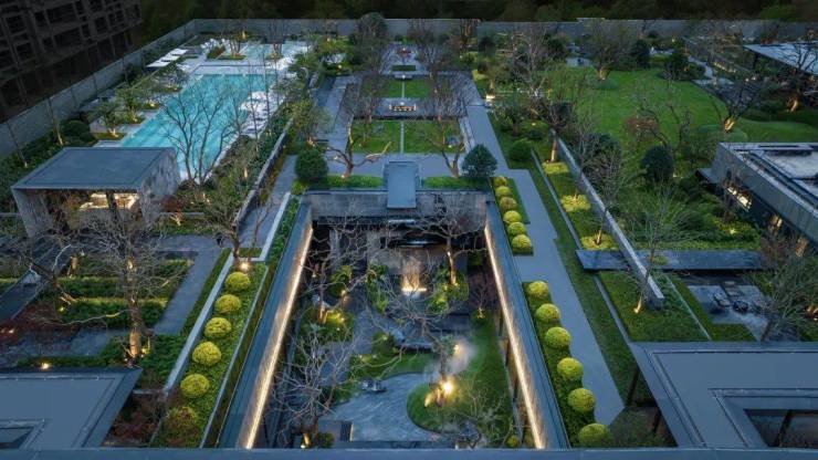 在四水归堂的中央景观区,还有由8棵榉树组成的树阵,气势磅礴。这是尚书里经典的传承和迭代,山川江樾园林的秩序感和尊贵感,不彰自显。