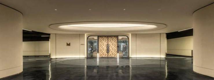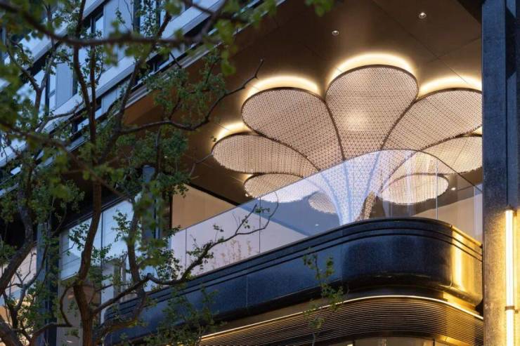 两侧景墙为蓝钻石材,100平透光穹顶为50片LV同款透光云石打造、顶部采用钻石切割技艺2毫米密缝拼贴的古铜色蜂窝铝板……