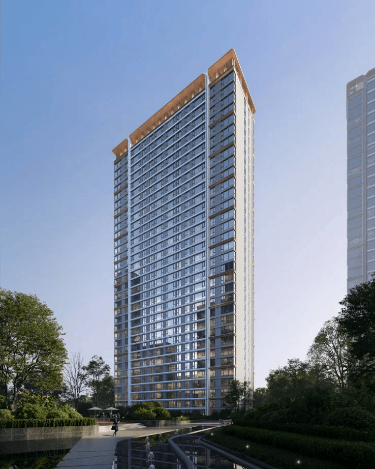以公建化美学为纲,通过经典三段式、线条与弧形转角的勾勒,着以米、灰、金高级三色,顶部为穿孔板折形韵律。