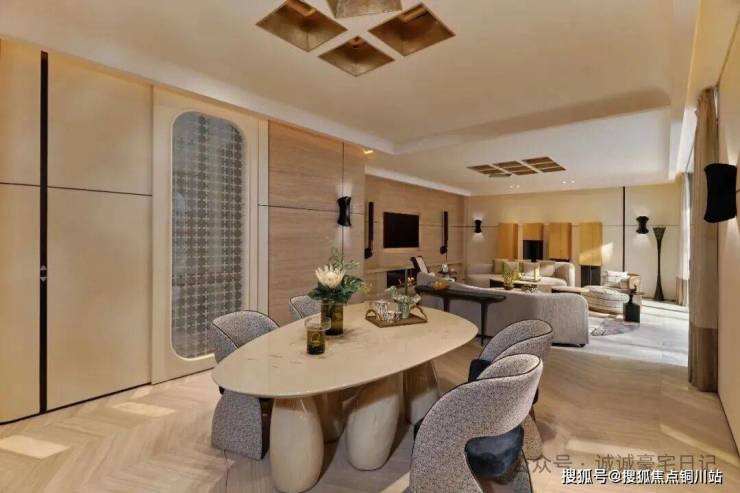 鹅卵石形态的餐桌配以不规则式的桌脚,再加之跳脱感的四宫格顶灯,让一席四座的用餐时光充满俏皮莞尔。