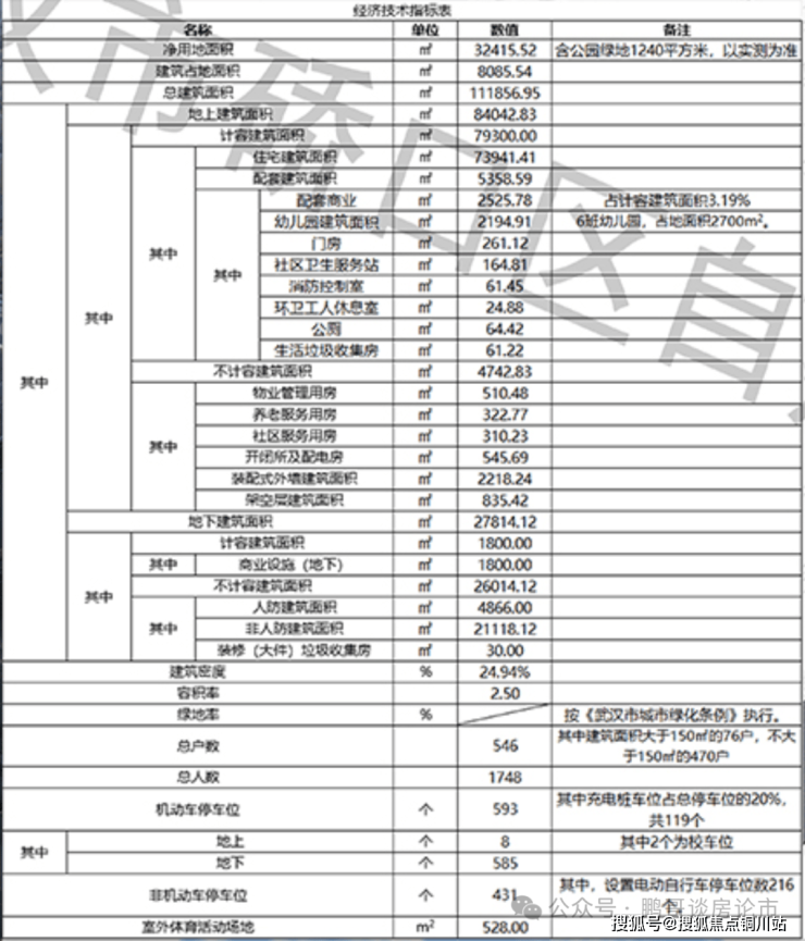 武汉城建·承宁府 规划净用地面积32415.52㎡(含公园绿地1240㎡,以实测为准),建筑占地面积8085.54㎡,总建筑面积111856.95㎡。地上建筑面积84042.83㎡,计容建筑面积79300.00㎡,住宅建筑面积73941.41㎡,配套建筑面积5358.59㎡,配套商业2525.78㎡,幼儿园建筑面积2194.91㎡(6班幼儿园占地面积2700㎡),门房261.12㎡,社区卫生服务站164.81㎡,消防控制室61.45㎡,环卫工人休息室24.88㎡,公厕64.42㎡。不计容建筑面积4742.83㎡,物业管理用房510.48㎡,养老服务用房322.77㎡,社区服务用房310.23㎡,架空层建筑面积835.42㎡。地下建筑面积27814.12㎡,地下计容建筑面积1800.00㎡,地下商业设施1800.00㎡,地下不计容建筑面积26014.12㎡。建筑密度24.94%,容积率2.50,总户数546户,总人数1748人。机动车停车位593个(含充电桩车位119个),非机动车停车位431个。室外体育活动场地528.00㎡。