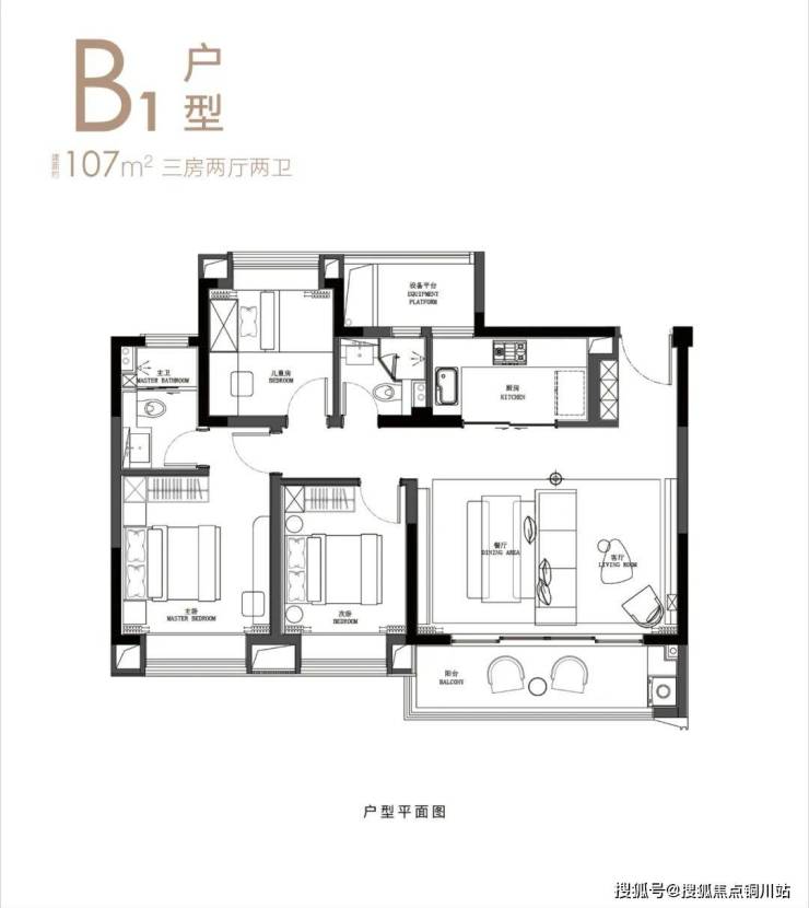 约107平明星户型,三房两厅两卫设计,四开间朝南,这是典型的最受欢迎的三口之家标准户型,也是市面上同等面积段产品中独有餐客一体LDK设计的户型。