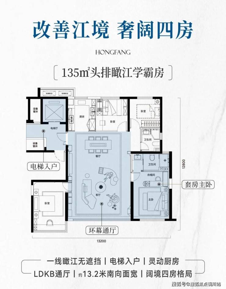 立于一线头排,客、餐、厨与阳台融为一体的LDKB设计,形成开阔的社交主场。晨昏交替,江水奔流,四季风光在窗前定格为美好的生活画卷。