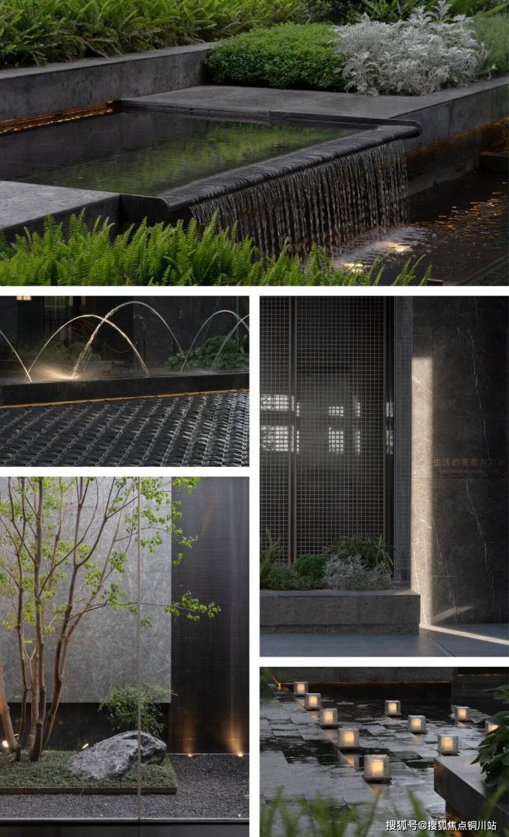 水体包裹菱形面,晶莹斑驳,似水柔和如绢布滑落,双影跳泉在高低层级不同的绿化环境内灵动跳跃,形成合院视线焦点,将绿意与水的灵性在温和中饱含力量。