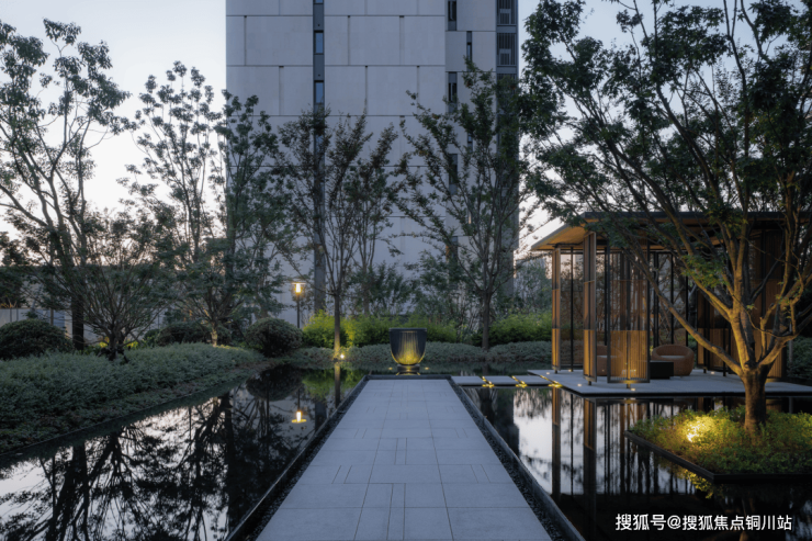 叠水、名花、贵石,自然洄游式的水亭设计,让人仿佛置身野奢度假酒店一般,现代建筑与自然野趣在此相映生辉。