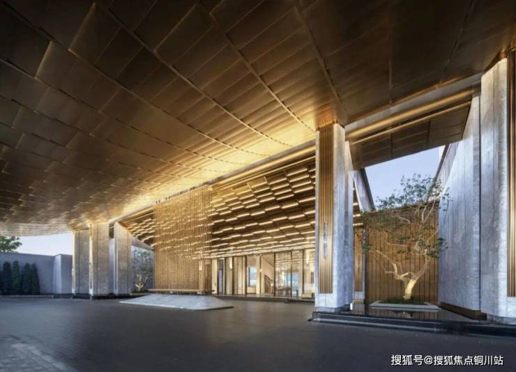 大门整体其设计灵感源自周代礼器“冕旒”,帝王冠冕垂珠的至高仪制,运用现代建筑语汇,构筑约85米长的"凤起冕旒"华贵门仪。经绿城的现代转译,升华为迎接时代精英的“精神冠冕”。