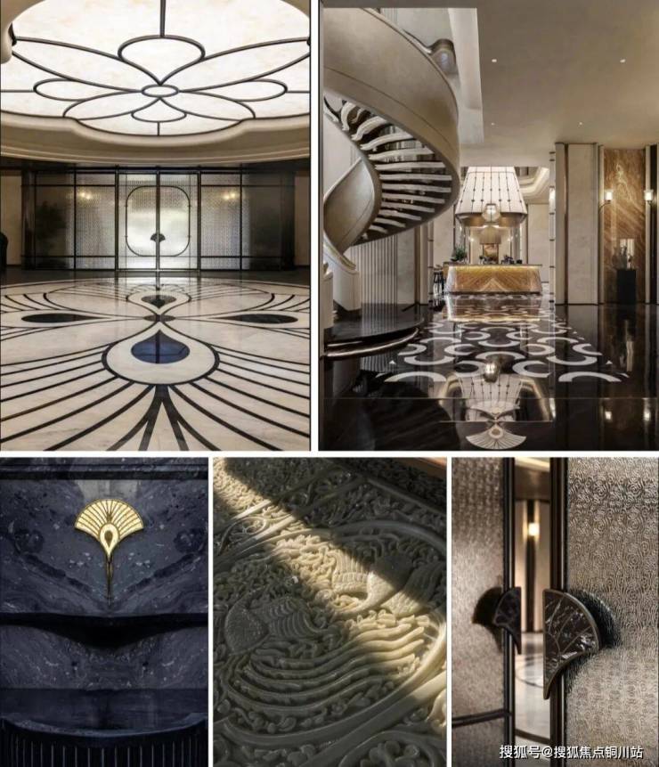 颜值与配置上,更是绿城炫技式的手笔。比如会所设计中将“凤羽”“梧脉”“潮声”等自然文化意象转化为“穹顶光厅”“旋梯”, 以漆绘工艺为笔,螺旋而上,似凤舞九天、扶摇直上;在地面上,可以看到各类非遗古法工艺与东方白的天然大理石、水吧是采用伊朗进口天然石材孔雀玉打造结合而成,既呈现 “东方美学”,又区别于市场上常见的西式奢华或传统中式,美出独立赛道。
