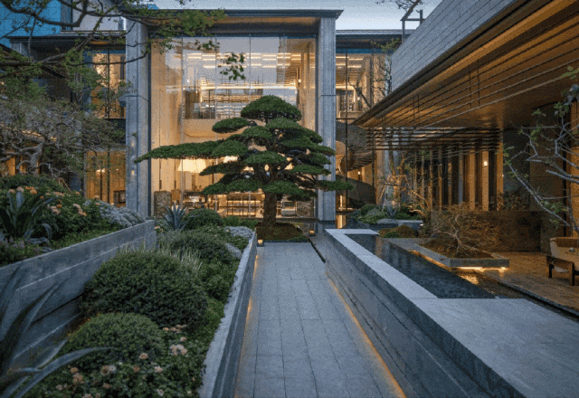 门庭景观融蕴东方哲思,选取种植8棵高大乔木、有罗汉松、铁冬青、朴树、金桂等珍稀树种,将奢石、水景与自然精巧融合,重塑一方承袭千年盛韵的尊荣场景。檐下光影空间明暗交织、移步易景,创造出既有礼序感又含沉浸式的归家体验。