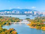 往里踱步,仿佛闯入一片静谧的山水林间。镜头推进,阳光下乌桕苍劲挺拔、羽毛枫飘逸清雅……天空和树木,倒映在澄净水面。