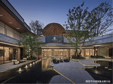 入园廊道天花板设计了星空顶,走道旁设有艺术装饰;往里走则是内庭水景区,让人仿佛踏进了喧闹城市中一方华丽又静谧的秘境,暖色灯光、林下休闲区,散发着慵懒的度假感。三进便是「艺术会所大堂」,请的是著名设计师吴滨。
