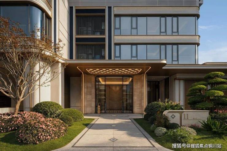 项目大门采用了杭州首个Art Nouveau的新艺术风格,入口横贯约80米,主楼约40米,大门由六扇曲面奢石墙体构成,采用大面积的维多利亚白奢石,端庄典雅、恢弘大气。加之大门顶部设计“金色流苏”装饰、曲线设计,工艺非常考究,当之无愧的城市级封面。