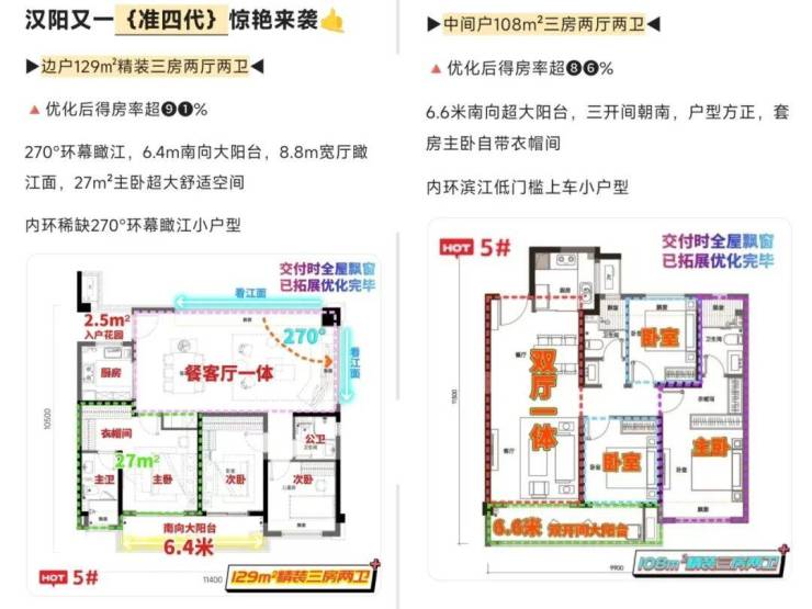 ✅户型:边户129㎡ 270°转角瞰江,中间户108㎡