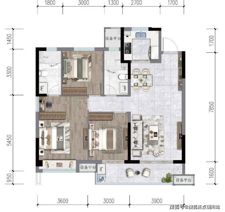 另一款建面约115㎡的户型,就更绝了,同样是三房两厅两卫、三开间朝南、主卧大套房的设计,尺度上却是PULS版本,格局也更加方正。