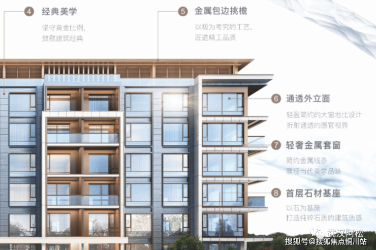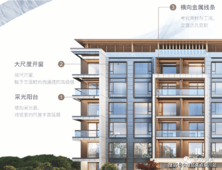 2、轻奢质感外立面+超大窗墙比设计,室内光线和视野都非常好。项目外立面采用大尺度开窗,用材包含首层石材基座、金属线条等,这种设计不仅可以保证户型光线,外立面看起来也非常大气。