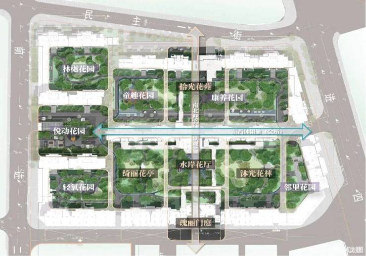 小区整体空间布局上采用:南北中心景观轴,东西邻里中心休闲轴,两道主要景观轴线,依托围合式住宅格局,充分利用超大尺度景观空间,打造「一庭两轴十花园」的主题园林景观。
