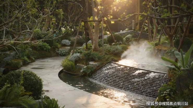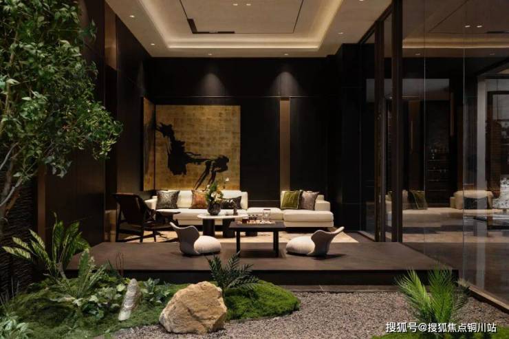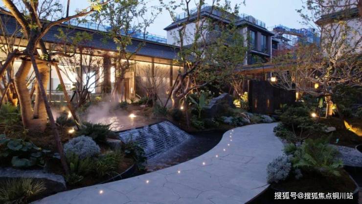 高大名木之间,深色奢石之上,跌水潺潺,一幅素雅山水画境悄然铺展,诠释东方园林的含蓄哲学。