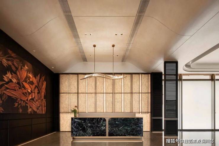 建筑提炼宋韵极简形制,以清雅色系石材、大面积玻璃彰显质感,配以贵金属材质勾勒传统纹饰,重构当代宋风美学的奢雅华贵。