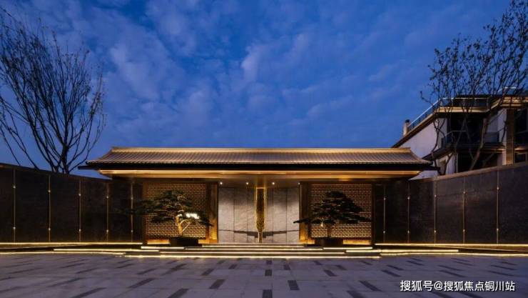 南侧主入口,一座宽约45米、高约6.9米的宋风门头,上方以飞檐戗角勾勒天际,两侧奢石景墙、重金属造型、造型迎客松、跌级水景对立,共同构筑一方彰显东方威仪与开阔格局的归家门面。