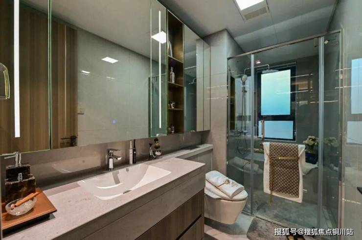 独立卫生间约6㎡,配备智能魔镜、科勒卫浴,干湿分离设计。这种配置,已经达到了高端改善的标准。