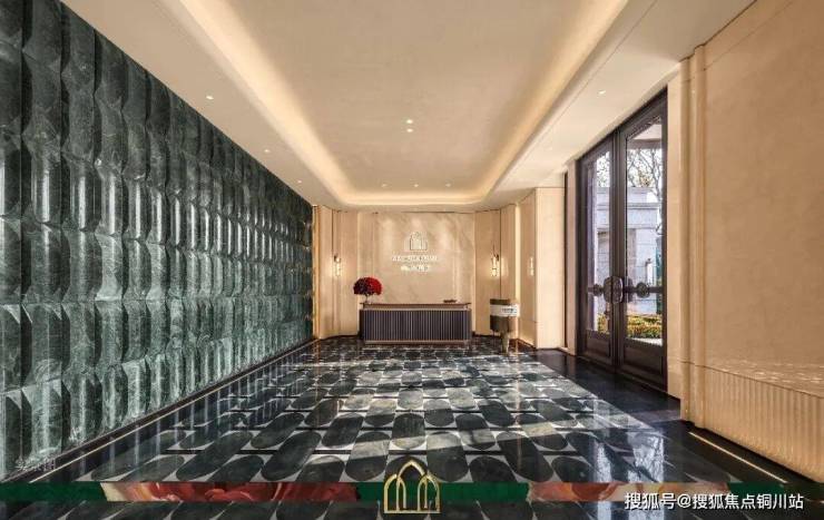 步入华贵大堂,地面以墨绿、雅黑、玉白三色石材拼花铺装,方形、椭圆形交错的纹饰图案,勾勒出层次分明且富有艺术感的效果。