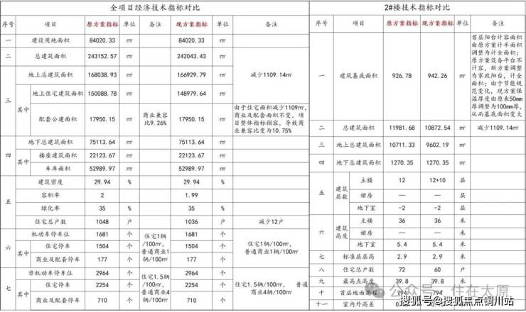原方案指标中的总建筑面积为243152.57平方米,现方案指标中的总建筑面积为242043.43平方米,减少了1109.14平方米。原方案指标中的总户数为1048户,现方案指标中的总户数为1036户,减少12户。其余详细经济指标见下图。