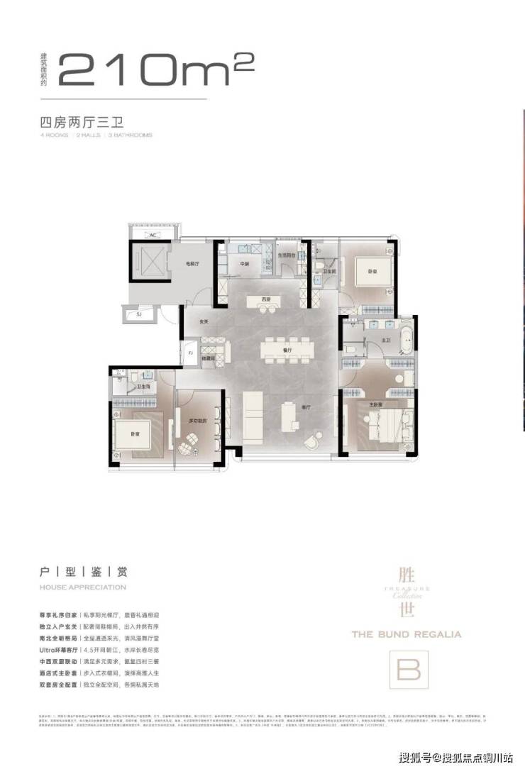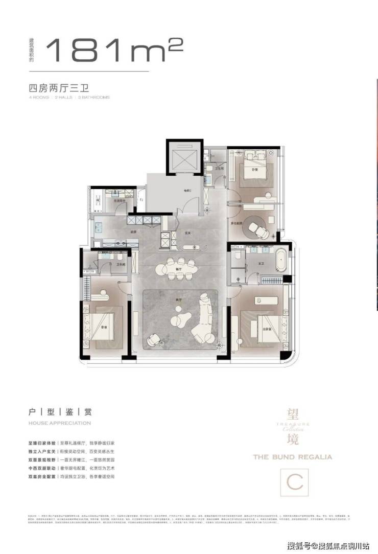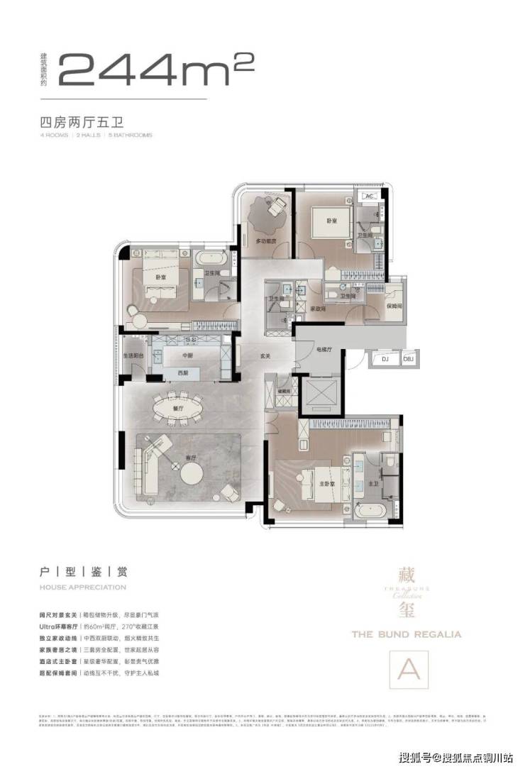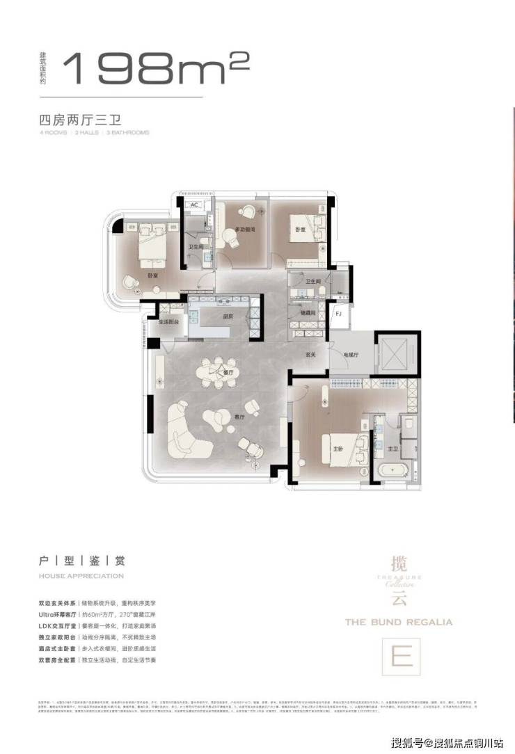 以198㎡户型为例,270°弧形观江设计,将江居的震撼感渗透到生活每一处。