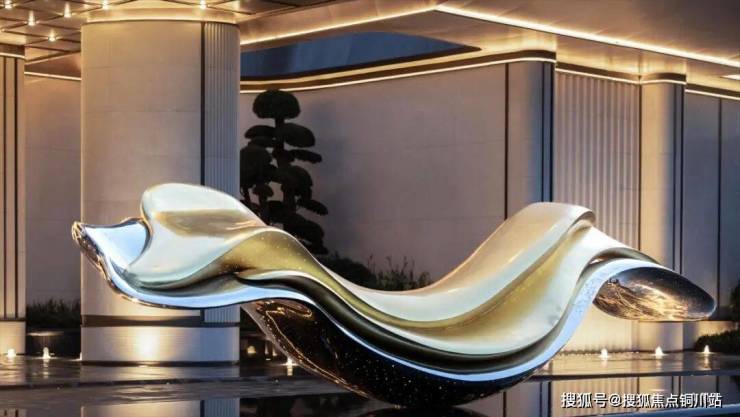 大门的吉祥物,是一个聚宝盆的造型。上方的“金元宝”,动用18K金箔,纯手工贴制,叠加下方的水景,流金淌银的既视感,送去迎门纳财的祝福。