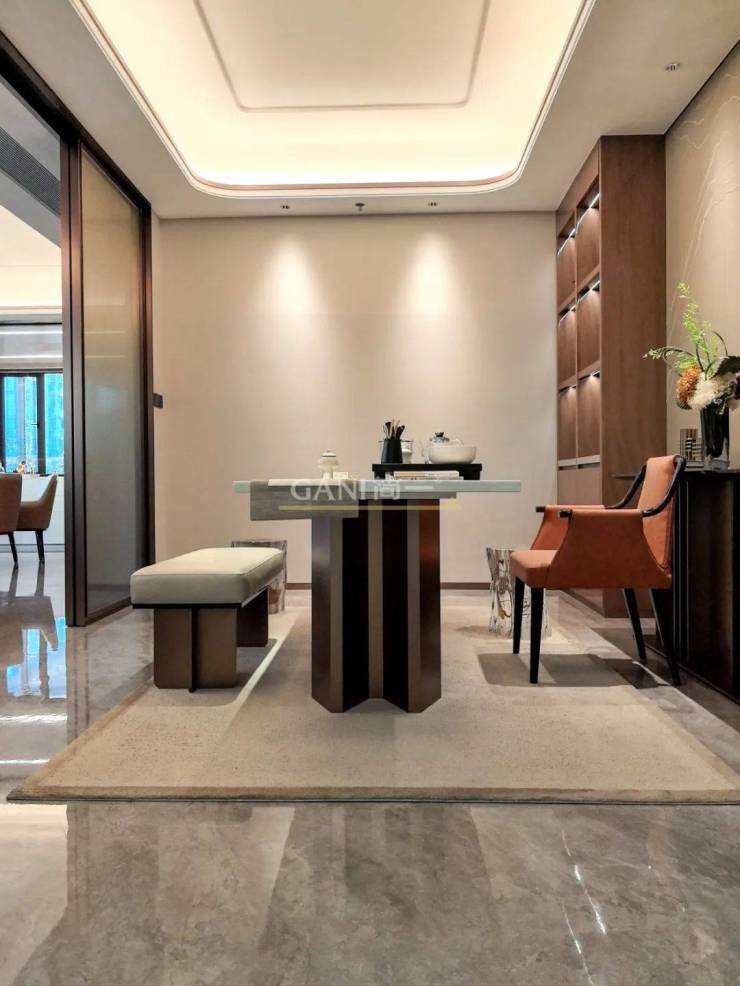 茶室空间静谧雅致,暖灰色调与木质家具相得益彰,营造出淡雅质朴的空间格调。芬迪灰大理石瓷砖纹理自然延伸,在<0.5mm密缝铺贴技术加持下空间整体性更强,地面宛如一整块天然石材,将自然之美带入室内。