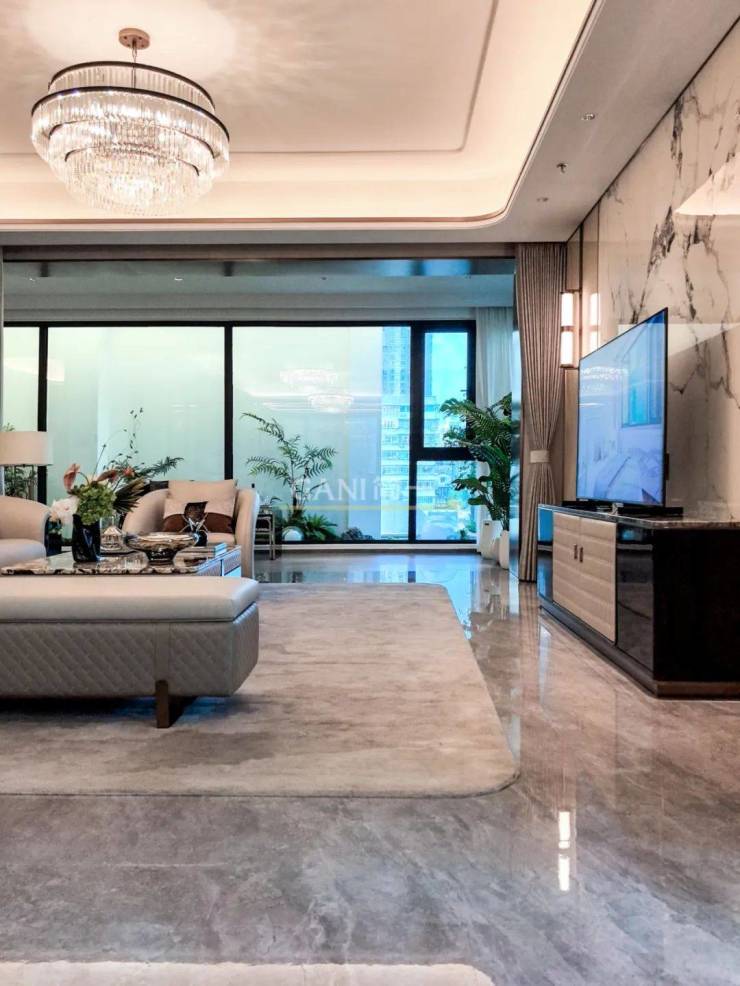 星级会客厅空间感与尺度感十足,宽绰连厅灵活改造,打造边厅270°MAX环幕江景视野。流畅的空间线条,让每一步的移动都自在随心。地面选用简一芬迪灰 复刻原始石材的天然纹理,简洁干净的灰白基调,纹路细腻而随性,尽显自然的独特魅力。