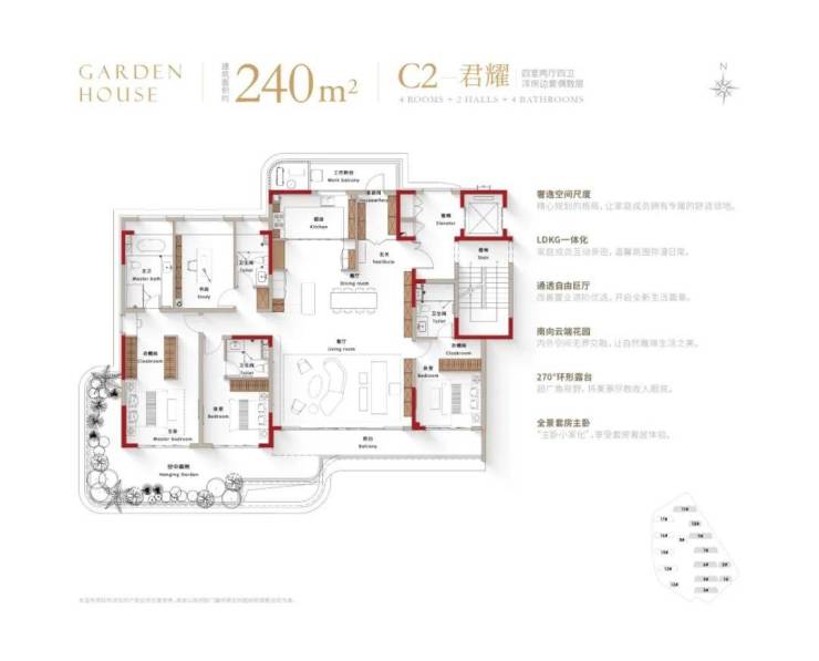 再来看看户型设计,完美呼应了四代宅的超高使用率,空中露台、阳台等各项数据的尺度非常惊人。