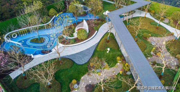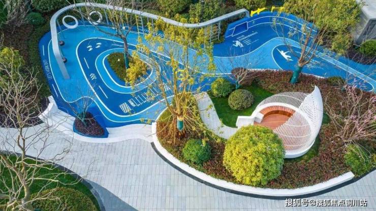 天萃还根据地块约3.7米的天然高地差,构造4D立体景观,以约600米环形跑道、1大活力共享水系串联起社区。
