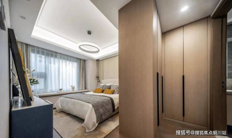而主卧是套间设计,不仅有步入式衣帽间,还有独立卫生间,约3.6米大开间,放下床之后,床尾还能放置收纳柜,空间也不显拥挤。
